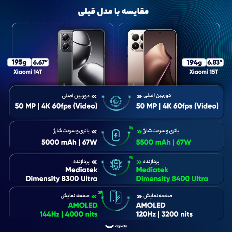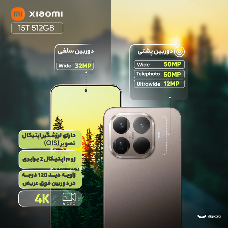 گوشی Xiaomi 15T جدیدترین گوشی از سری پرطرفدار T شیائومی هست که همیشه حرفی برای گفتن دارد. این قاتل پرچمدار ترکیب طراحی لوکس، سختافزار قدرتمند و نمایشگری خیرهکننده را در خود جای داده است. در بخش طراحی با قاب جلویی از جنس شیشه و فریم پلاستیکی در ابعادی باریک و خوشدست طراحی شده و میتوان گفت که با یک گوشی زیبا طرف هستیم. از طرفی گواهی IP68 نشان میدهد که این گوشی در برابر گرد و غبار و نفوذ آب تا عمق سه متر مقاوم است. در بخش نمایشگر، پنل AMOLED با نرخ نوسازی ۱۲۰ هرتز، پشتیبانی از تکنولوژی Dolby Vision و روشنایی خیرهکنندهی ۳۲۰۰ نیت تجربه دیداری فوقالعاده ارائه میدهد. در بخش پردازنده، تراشه Dimensity 8400 Ultra ساخت شرکت مدیاتک، بههمراه حافظههای سریع UFS 4.1 و رم ۱۲ گیگابایتی، تضمین میکند که در اجرای بازیها و برنامههای سنگین هیچگونه افت عملکردی احساس نکنیم. سیستم دوربین سهگانه ۵۰ مگاپیکسلی با لنزهای ساخت شرکت Leica و سنسور رنگ اختصاصی، کیفیت تصویربرداری 15T را به گوشیهای پرچمدار نزدیک کرده است. دوربین سلفی ۳۲ مگاپیکسلی هم با پشتیبانی از HDR10+ و فیلمبرداری 4K، یک انتخاب ایدهآل برای تولید محتوا محسوب میشود. باتری قدرتمند ۵۵۰۰ میلیآمپرساعتی و شارژ فوق سریع ۶۷ واتی، شارژدهی عالی و شارژ کامل در کمتر از یک ساعت را به همراه دارد. همه اینها در کنار سنسور اثر انگشت زیر صفحه نمایش، پشتیبانی از Wi-Fi پیشرفته و بلوتوث نسخه 6.0 ، 15T را به یکی از متعادلترین و جذابترین گوشیهای بازار تبدیل کرده است.