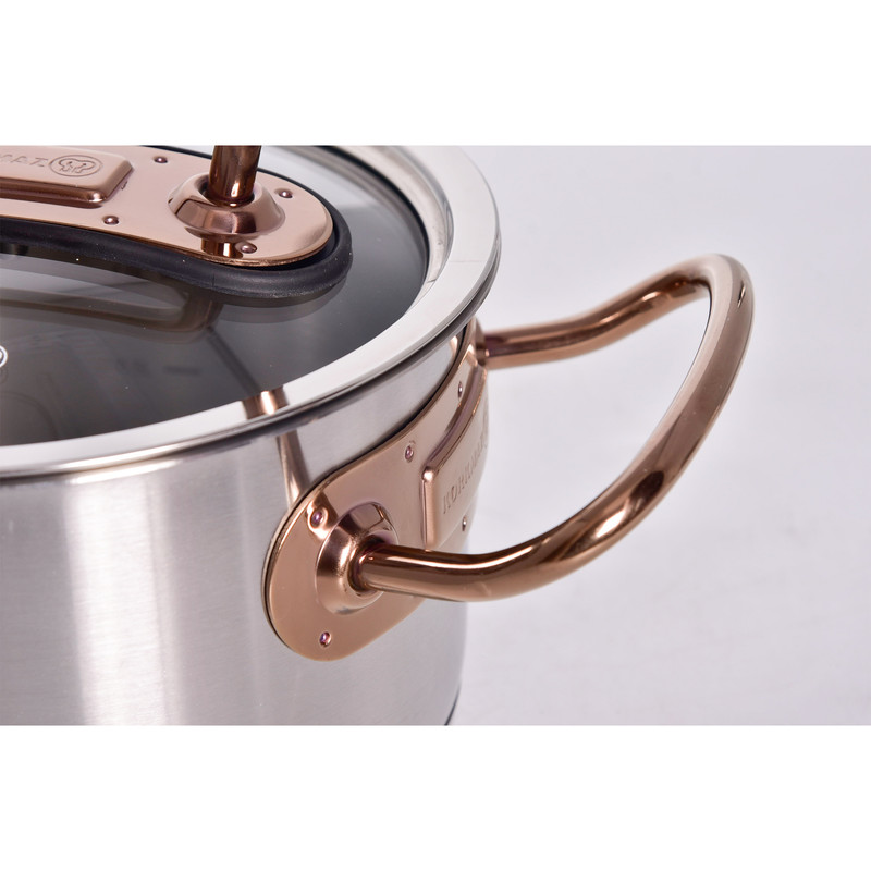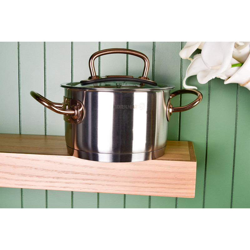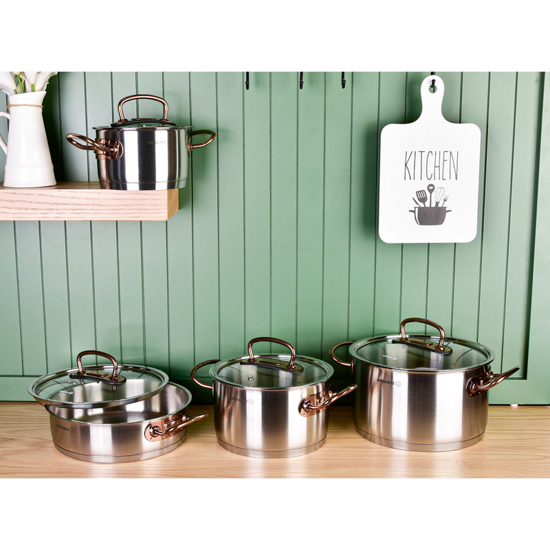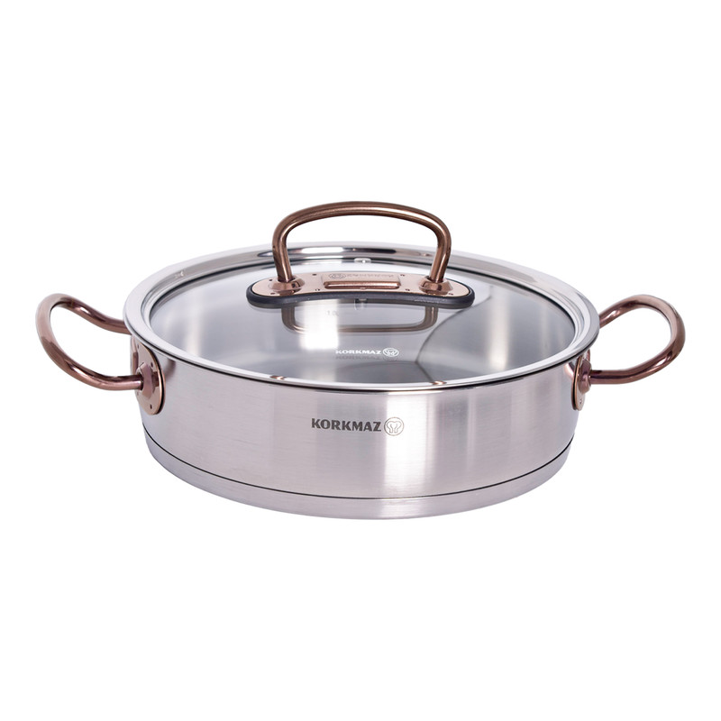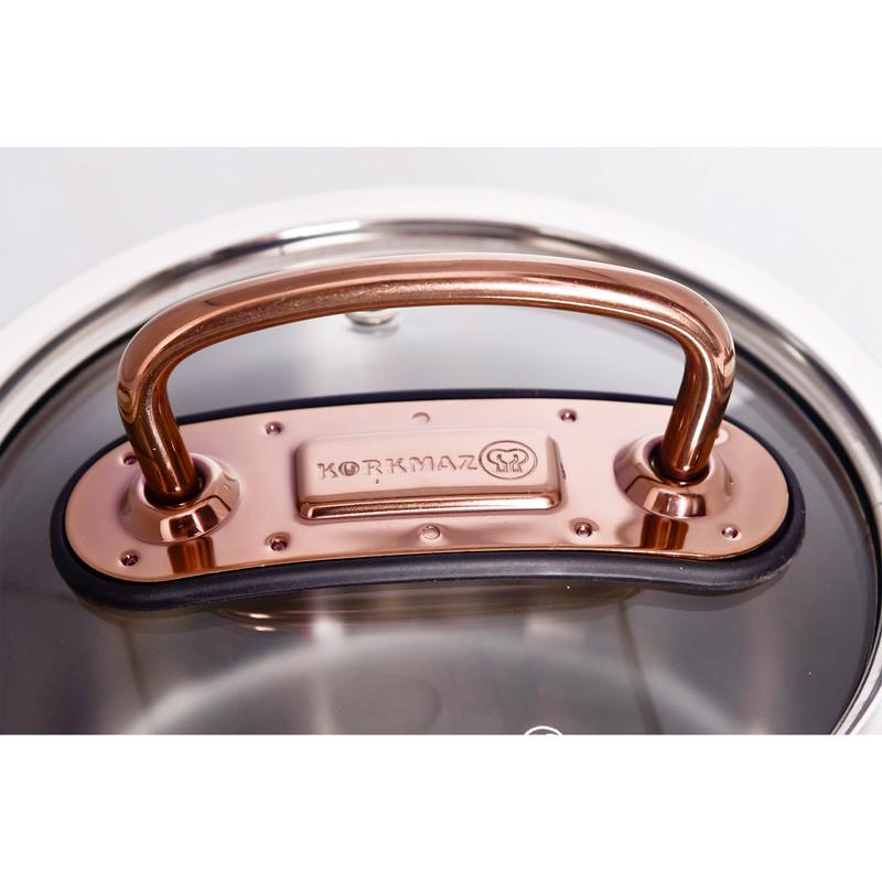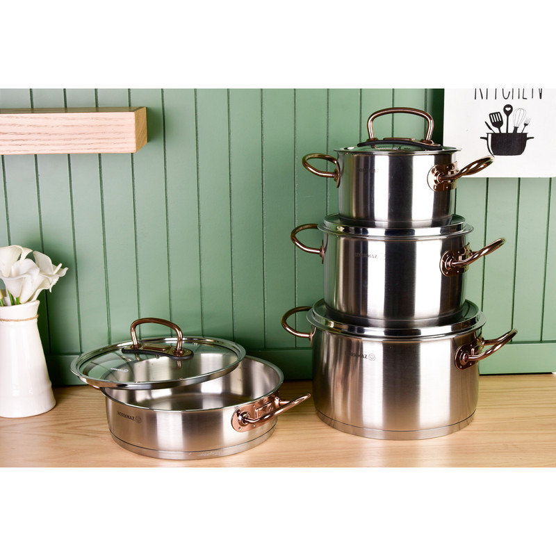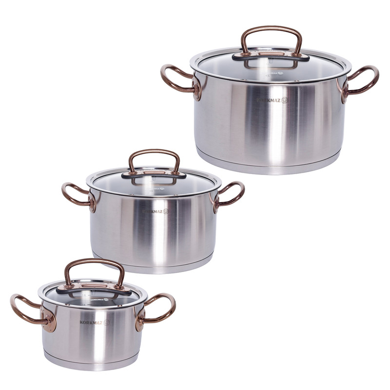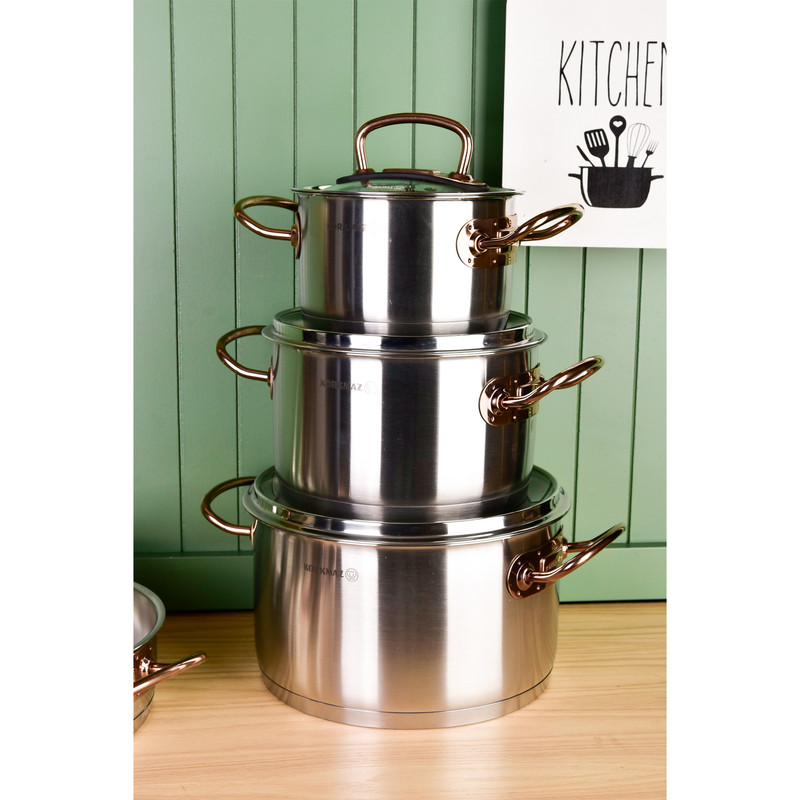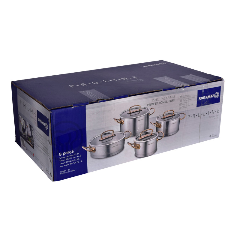 سرویس قابلمه کرکماز Proline A1149 یکی از محصولات برند korkmaz است . برند کرکماز یکی از برند های محبوب ترکیه می باشد که به اروپا هم صادرات دارد. دستگیرههای این سرویس از استیل ضد زنگ و به رنگ زرگلد (متمایل به رنگ مسی) ساخته شده است. برای ساخت قابلمهها از استیل ضد زنگ 18/10 (Cr-Ni 18/10 stainless steel) استفاده گردیده که این استیل حاوی 18 درصد کروم و 10 درصد نیکل میباشد. وجود کروم و نیکل در این استیل باعث مقاومت و ظاهر براق قابلمهها خواهد شد.سرویس قابلمه 8 پارچه کرکماز مدل Proline A1149 از 3 قابلمه درب دار با ظرفیتهای 2، 4 و 6.3 لیتر تشکیل شده است که ابعاد آنها به ترتیب 20×12.5 ،16×10 و 24×14 سانتیمتر میباشد. در این سرویس یک عدد تابه درب دار با گنجایش 3.1 لیتر و ابعاد 24×7 سانتیمتری نیز وجود دارد. طراحی دربها به گونهای است که به خوبی بر روی قابلمهها قرار میگیرد و بخار داخل آن را حبس خواهد کرد و همچنین بدنه عایق مانند این سرویس باعث حفظ دمای مناسب برای مدت طولانی خواهد شد.دستگیرههای سرویس قابلمه مدل Korkmaz Proline A1149 دارای طراحی ارگونومیک میباشند و به راحتی میتوانید آنها را جابهجا کنید. مقاومت دستگیرهها در برابر حرارت و اتصال محکم آنها موجب شده است که این سرویس از هر نظر ایمن باشد. کف قابلمهها به صورت کپسول آلومینیومی و با ضخامت 8 میلیمتر ساخته شده است که باعث توزیع همگن گرما در کف خواهد شد و همچنین این کفه بازدهی بالاتری در انتقال گرما داشته و در زمان و انرژی مصرفی شما صرفهجویی خواهد کرد جنس درب این ظروف شیشه نشکن نسوز می باشد. از ویژگی دیگر سرویس پخت و پز کرکماز میتوان به موارد زیر اشاره کرد : نگهداری سالم غذا . پخت و پز بدون روغن . قابلیت استفاده بر روی اجاقهای القایی . قابلیت شستشو در ماشین ظرفشویی را نیز دارذ.