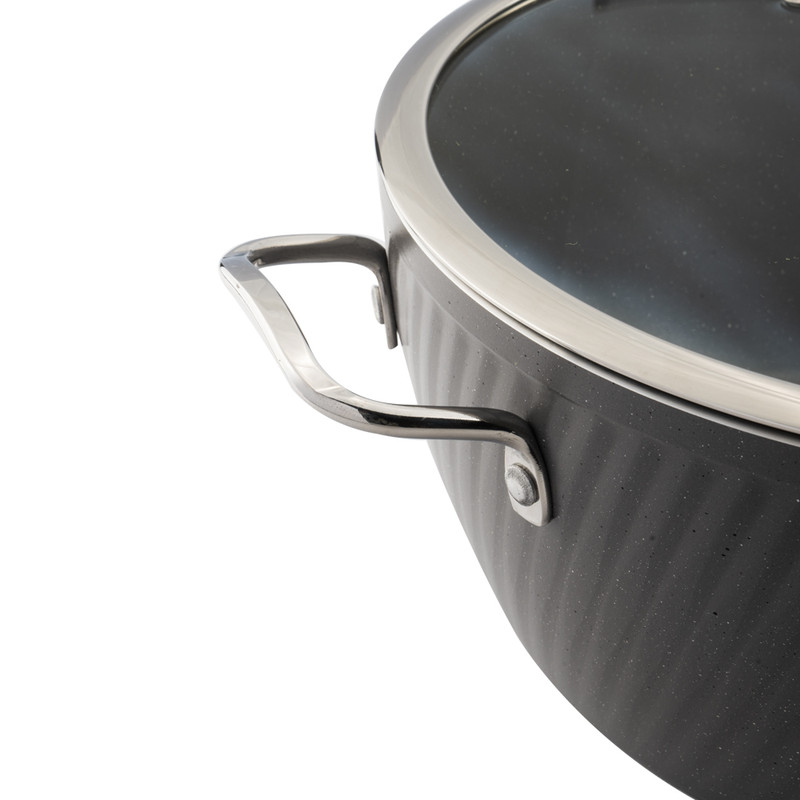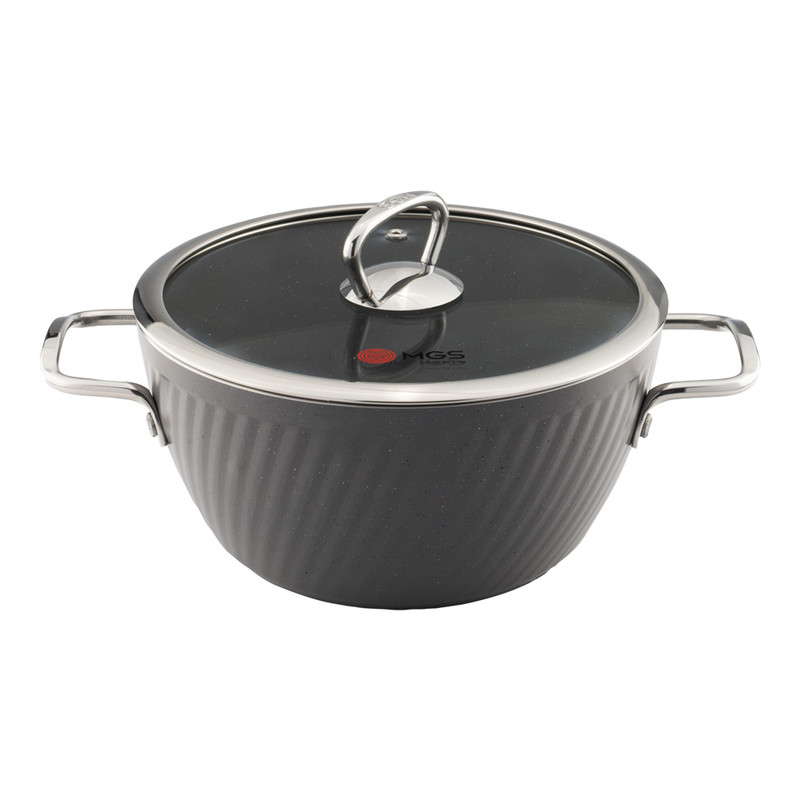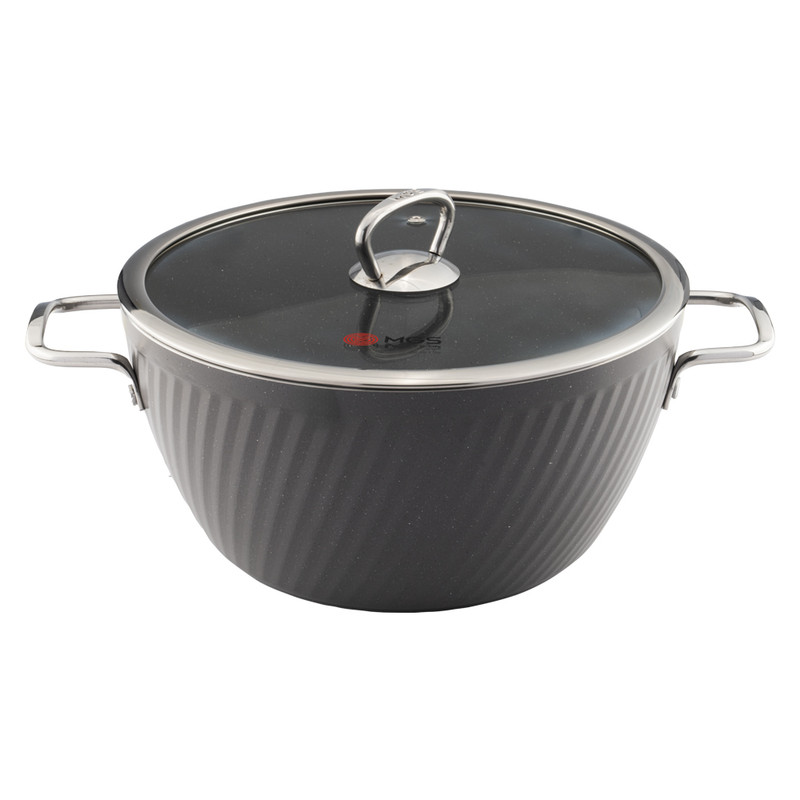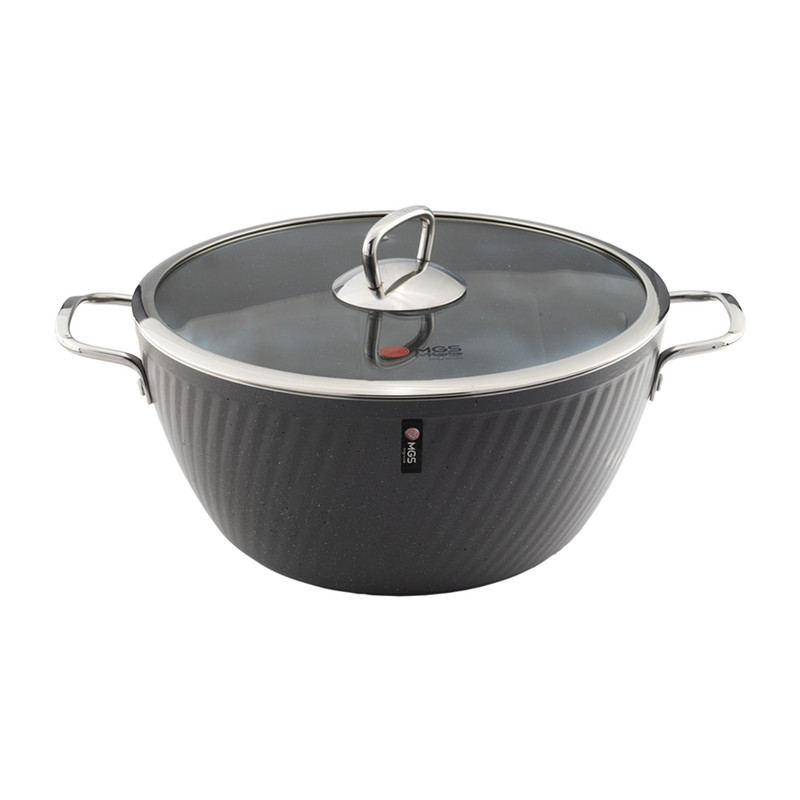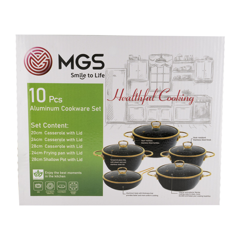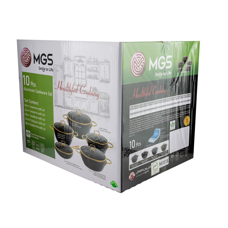 این سرویس قابلمه 10 پارچه طرح ماینز شامل چهار قابلمه و چهار درب پیرکس بعلاوه یک تابه دو دسته همراه درب و یک دو عدد دستگیره است. جنس روکش این ست، گرانیت نچسب است. نحوه ساخت این سرویس قابلمه 10 پارچه فورج و دستههای آن به بدنه متصل شده است.