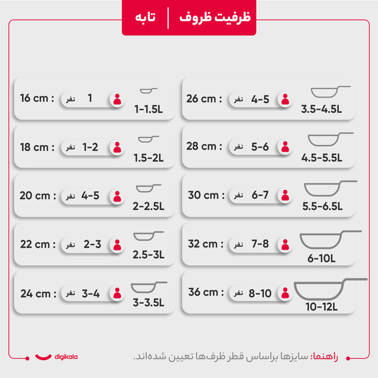 وزن ظروف: قابلمه سایز 32: 2900 گرم، قابلمه سایز 28: 2325 گرم، قابلمه سایز 26: 1840 گرم، قابلمه سایز 24: 1230 گرم، تابه دو دسته سایز 28: 2045 گرم
