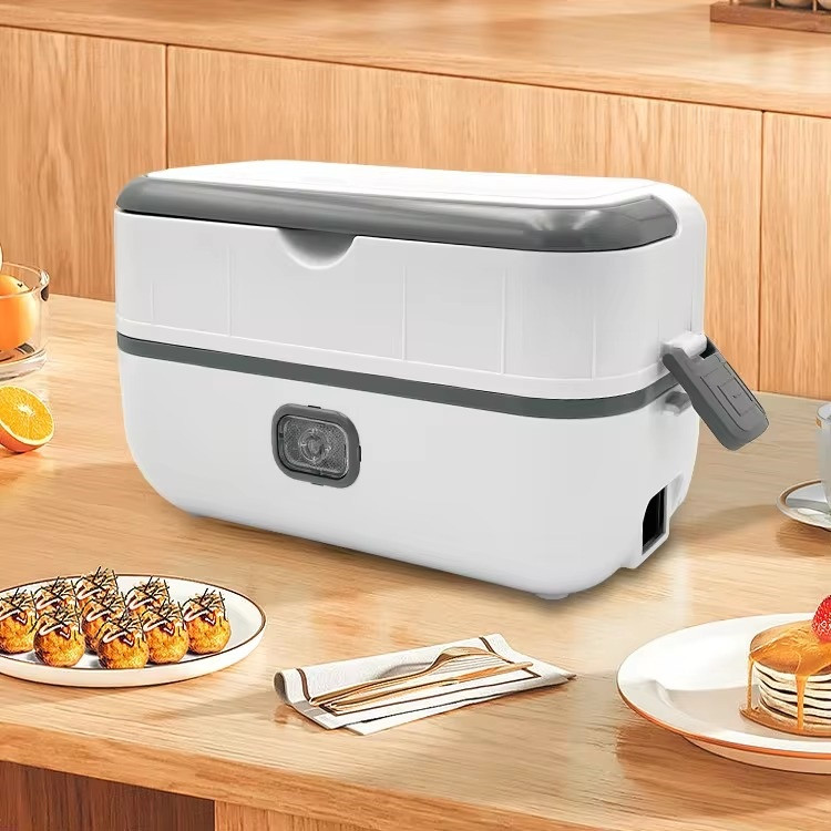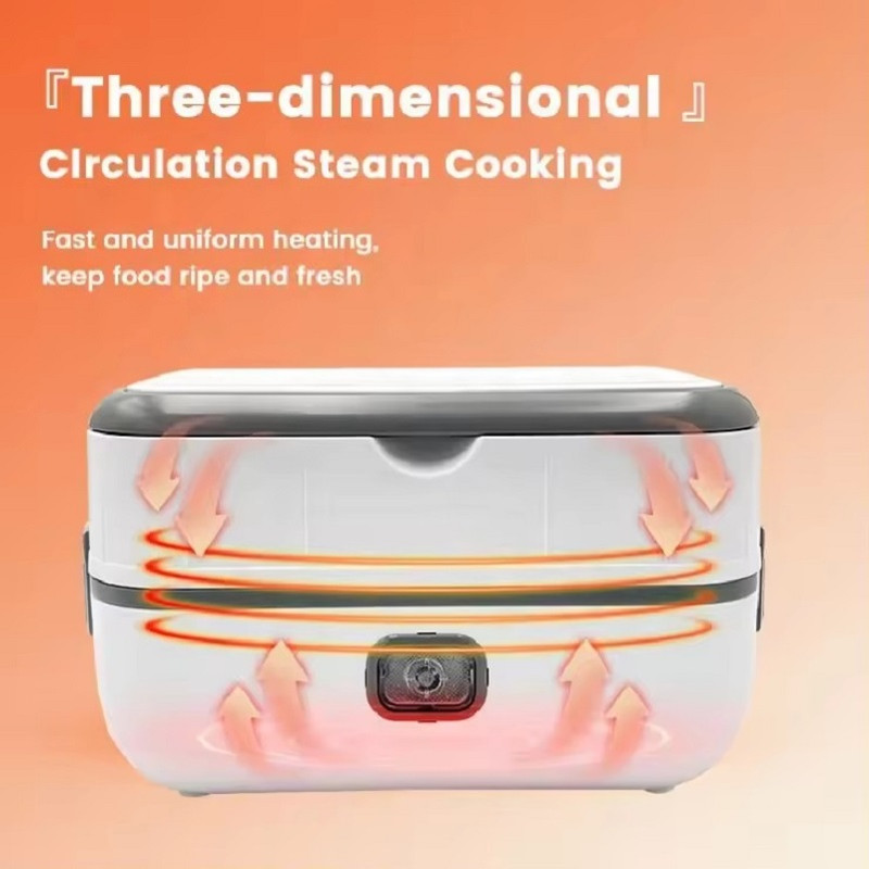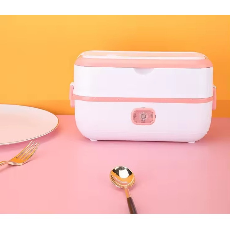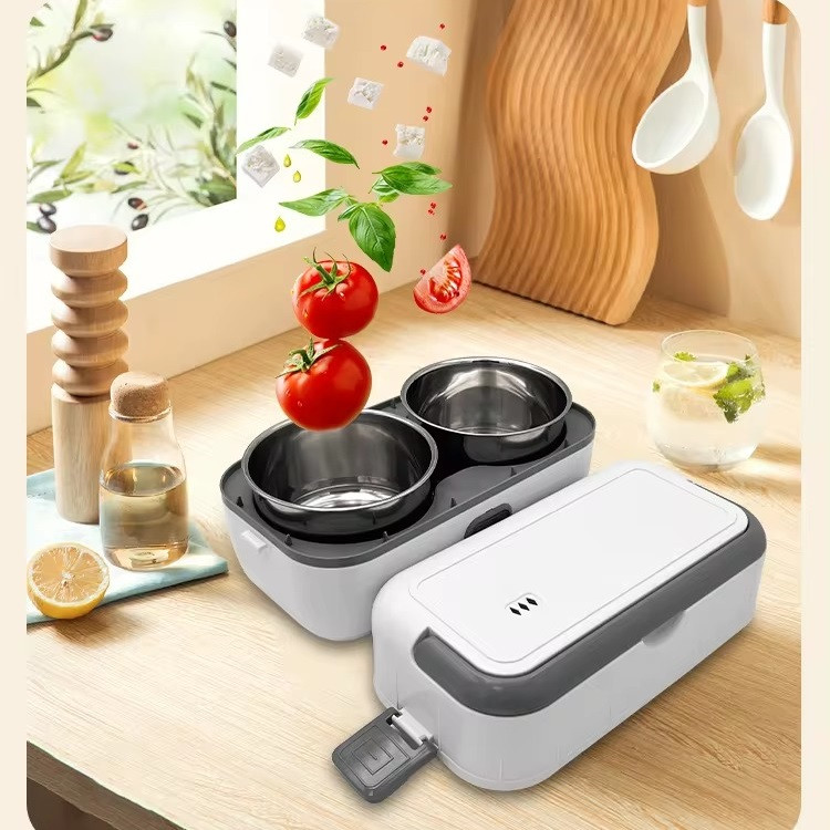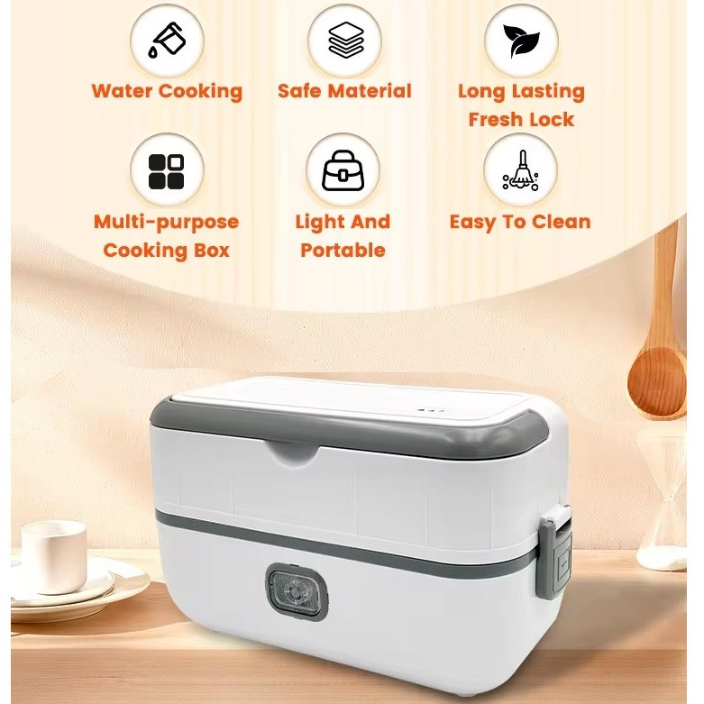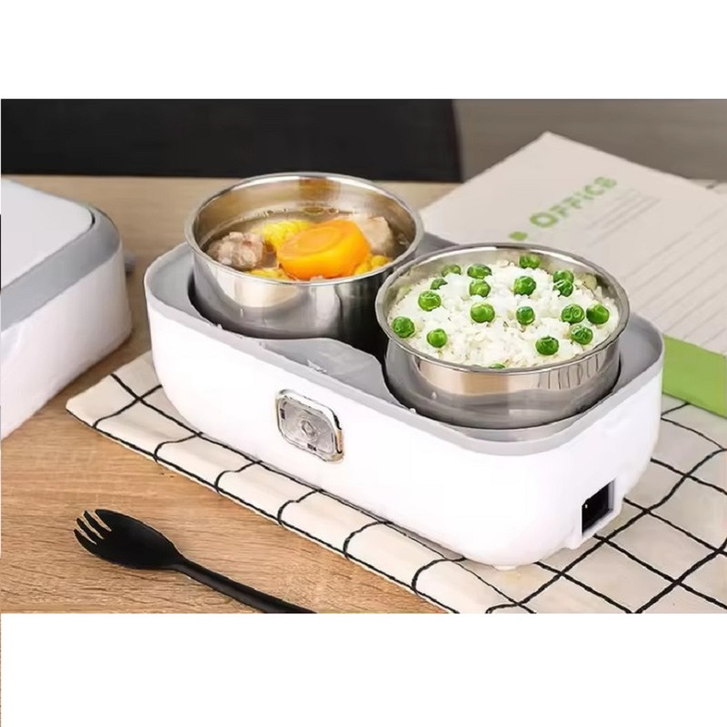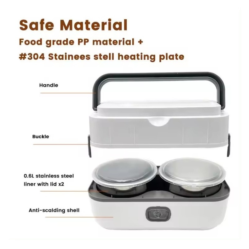 ظرف غذای برقی 1 لیتری قابل حمل، با 2 کاسه استیل ضد زنگ، و بدنه پلاستیکی گرید مواد غذایی(Food Grade) مناسب برای گرم کردن غذا و پخت پلو، سبزیجات، تخم مرغ آبپز و کاستارد میباشد. | استفاده از ظرف بسیار ساده بوده و با یک دکمه قطع/وصل روشن شده و با اتمام آب کف ظرف به صورت اتومات خاموش میگردد. | وزن ظرف غذا 800 گرم با ابعاد 15*12*25 سانتیمتر بوده، و ظرفیت هر کاسه 500 سیسی میباشد. توان دستگاه 200 وات بوده و با برق 220 ولت کار میکند.