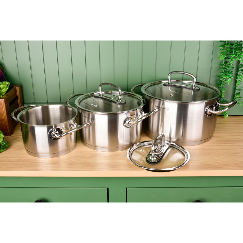 اقلام سرویس این مجموعه ۸ پارچه شامل سه قابلمه و یک تابه دو دسته است. جنس درها ترکیبی از استیل و شیشه بوده تا امکان مشاهده روند پخت فراهم باشد. جنس دستهها از استیل و دستگیرههای روی در از فلز ساخته شدهاند و به صورت پرچ شده محکم شدهاند. این سرویس از نظر سازگاری بسیار گسترده بوده و قابل استفاده روی اجاق گاز، اجاق برقی و ماشین ظرفشویی است.