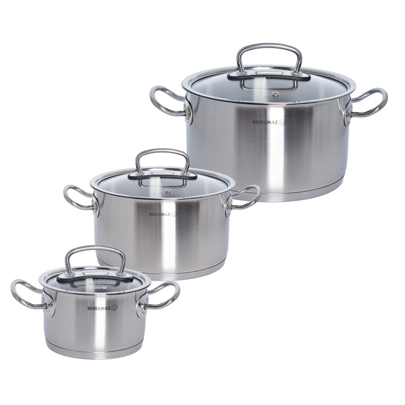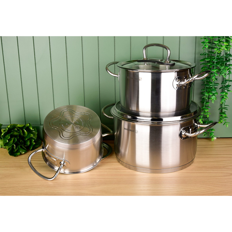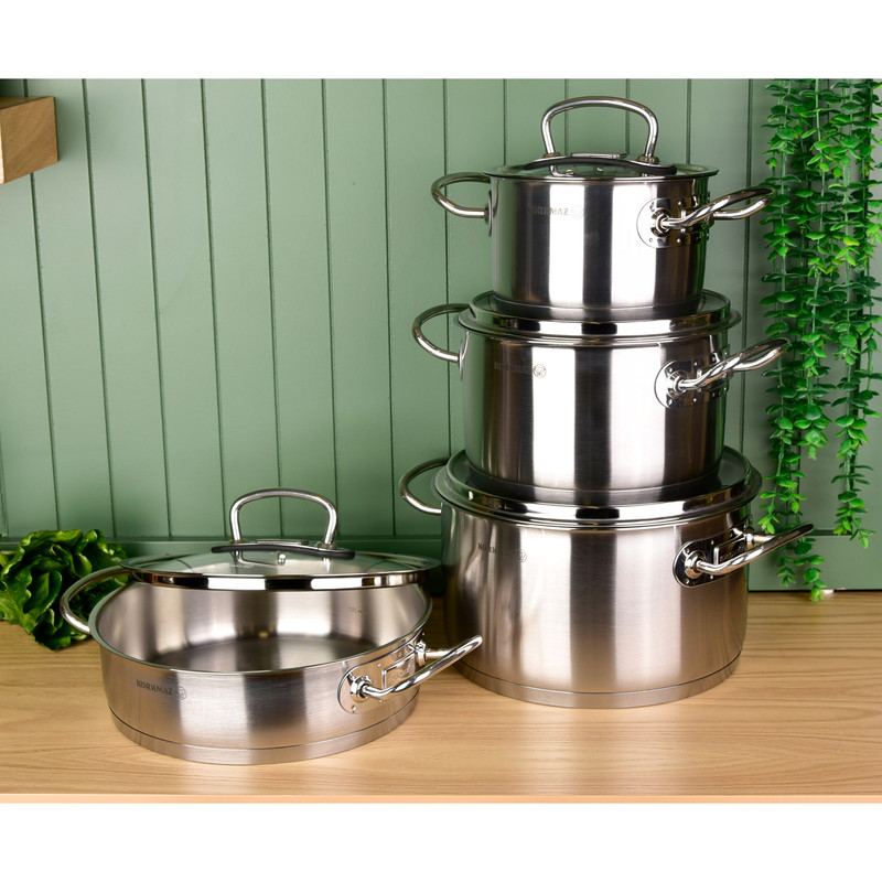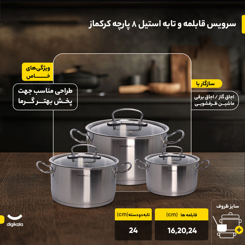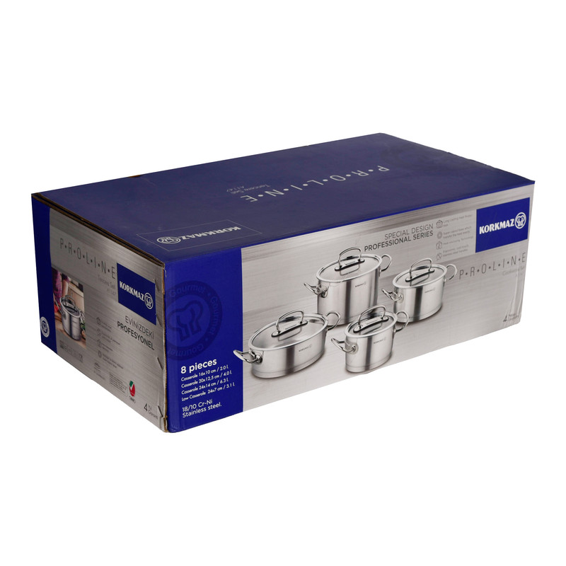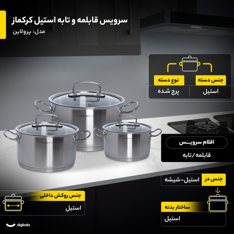 سرویس هشت پارچه قابلمه و تابه کرکماز مدل پرولاین کد ۱۱۴۷، مجموعهای شیک و بادوام است که در کشور ترکیه تولید شده است. ساختار بدنه اصلی و جنس روکش داخلی تمامی ظروف از استیل ضدزنگ باکیفیت ساخته شده است. این سرویس به دلیل ساختار استیلی، دارای ویژگی خاص طراحی مناسب جهت پخش بهتر گرما است که پخت یکنواخت غذا را تضمین میکند.