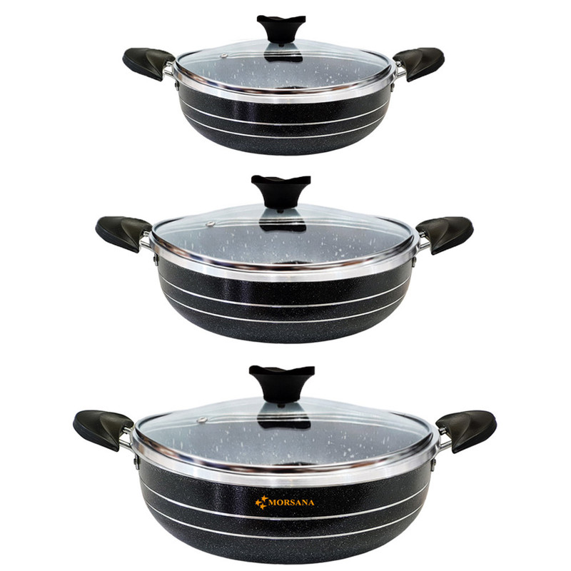 طراحی دسته ها از جنس عایق، حس نرمی و راحتی را به مصرف کننده می دهد. این ست ماهیتابه در سایز ها و رنگبندی مختلف می باشد که به راحتی با هر آشپزخانه ای ست شده و آشپزی را برای شما آسان نموده. همچنین شستشوی آن آسان است و با یک اسفنج نرم نیز به راحتی تمیز میشود.