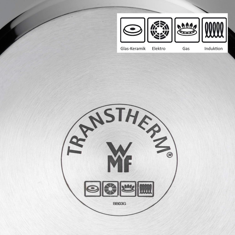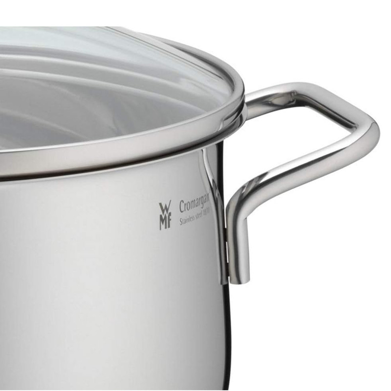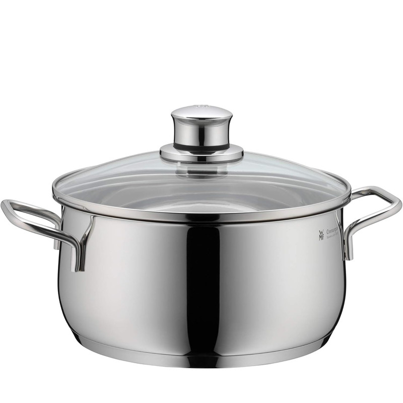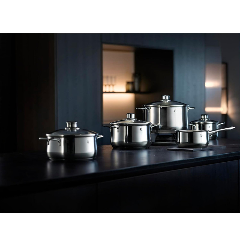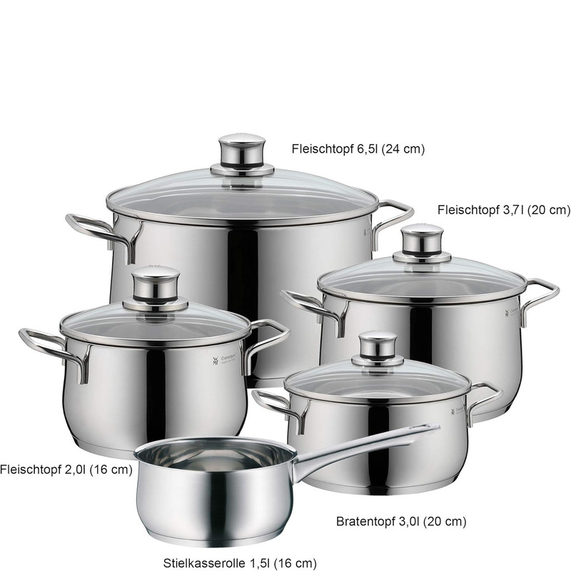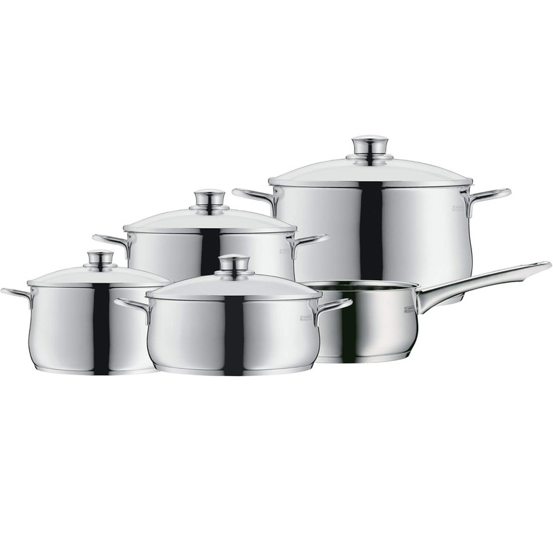 سرویس قابلمه 9 پارچه دبلیو ام اف مدل WMF Diadem Plus از 9 قطعه ساخته شده که جنس آن از فولاد کرومارگان ضد زنگ است و جنس درب آن از استیل و شیشه مقاوم در برابر حرارت تا 250 درجه سانتیگراد است . داخل قابلمه ها با درجه بندی مشخص شده که آشپزی را راحت تر می کند . کف سه لایه جهانی ثبت شده TransTherm به لطف توزیع و حفظ بهینه گرما ، هنگام پخت و پز در مصرف انرژی صرفه جویی می کند . این سرویس شامل قابلمه سایز 16 سانت با ظرفیت 1.9 لیتر و سایز 20 کوتاه با ظرفیت 2.5 لیتر و سایز 20 بلند آن با ظرفیت 3.3 لیتر و قابلمه 24 سانت با ظرفیت 5.7 لیتر و شیرجوش سایز 16 سانتی متر آن با ظرفیت 1.7 لیتر می باشد .