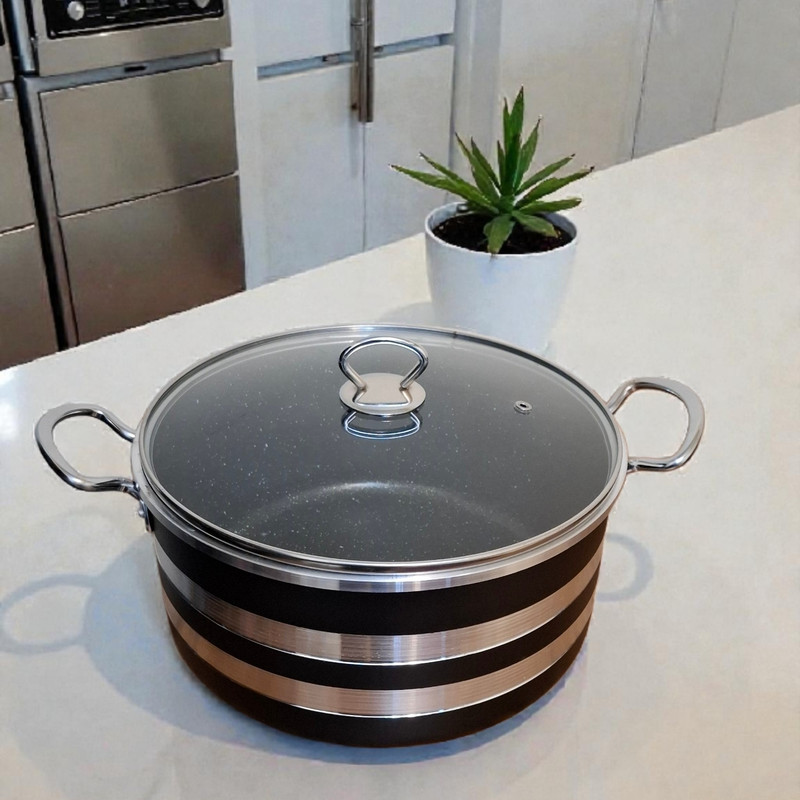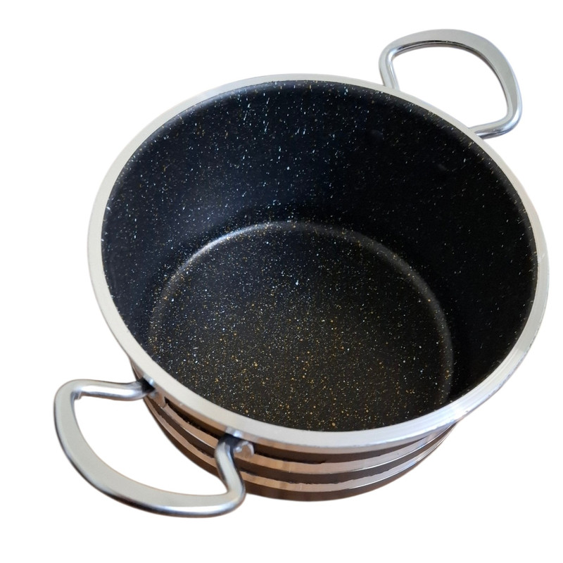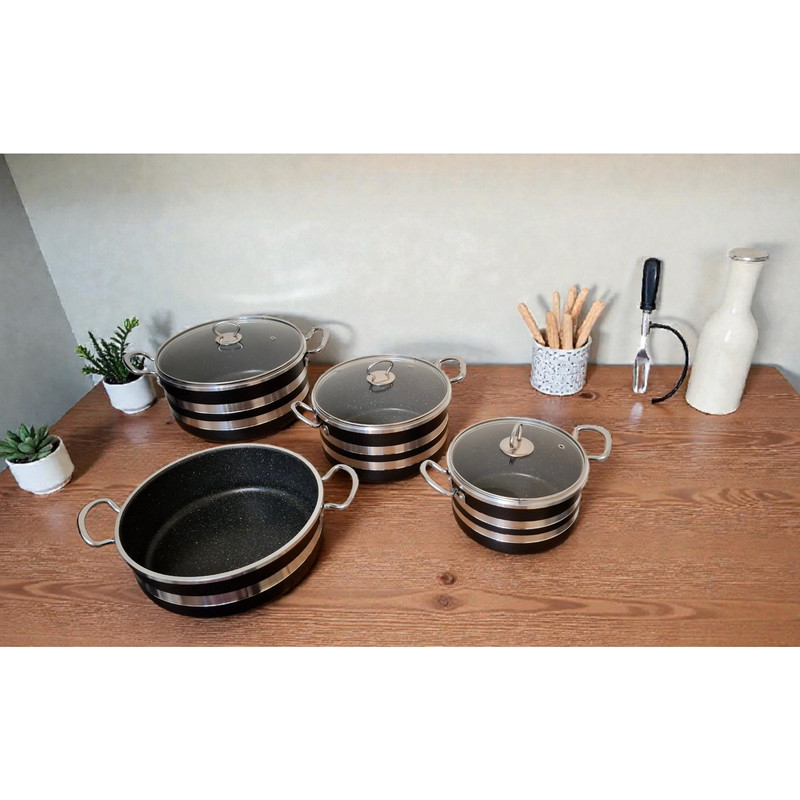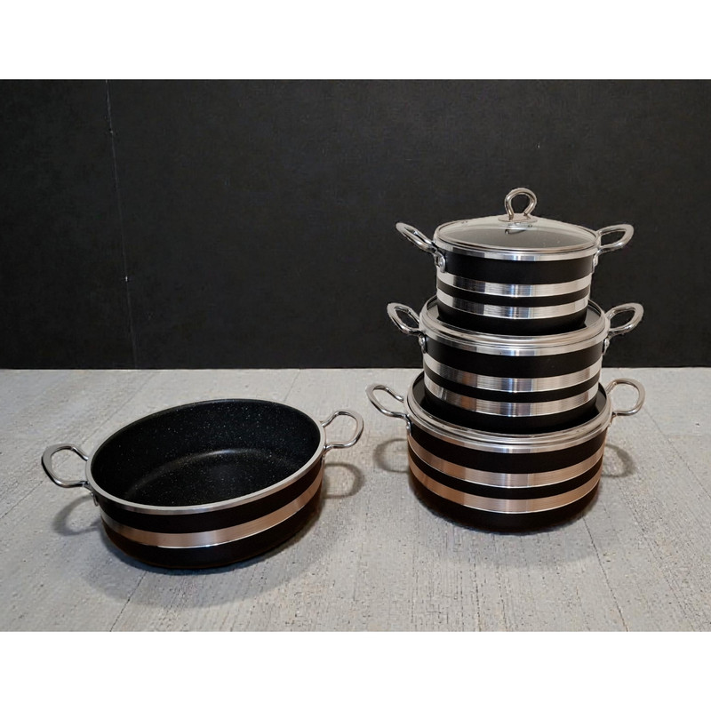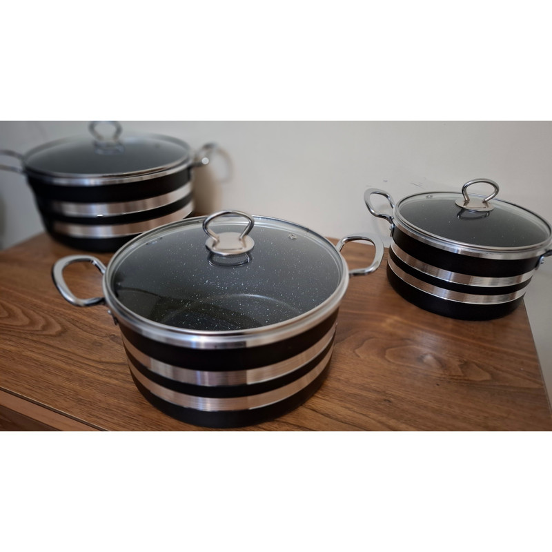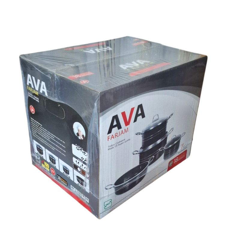سرویس پخت و پز مدل آوا شامل سه قابله به سایز های ۲۰،۲۴ و ۲۸ و یک تابه به سایز ۲۸ میباشد.جنس محصول آلومینیوم ضخیم با روکش گرانیت و دسته استیل می باشد.